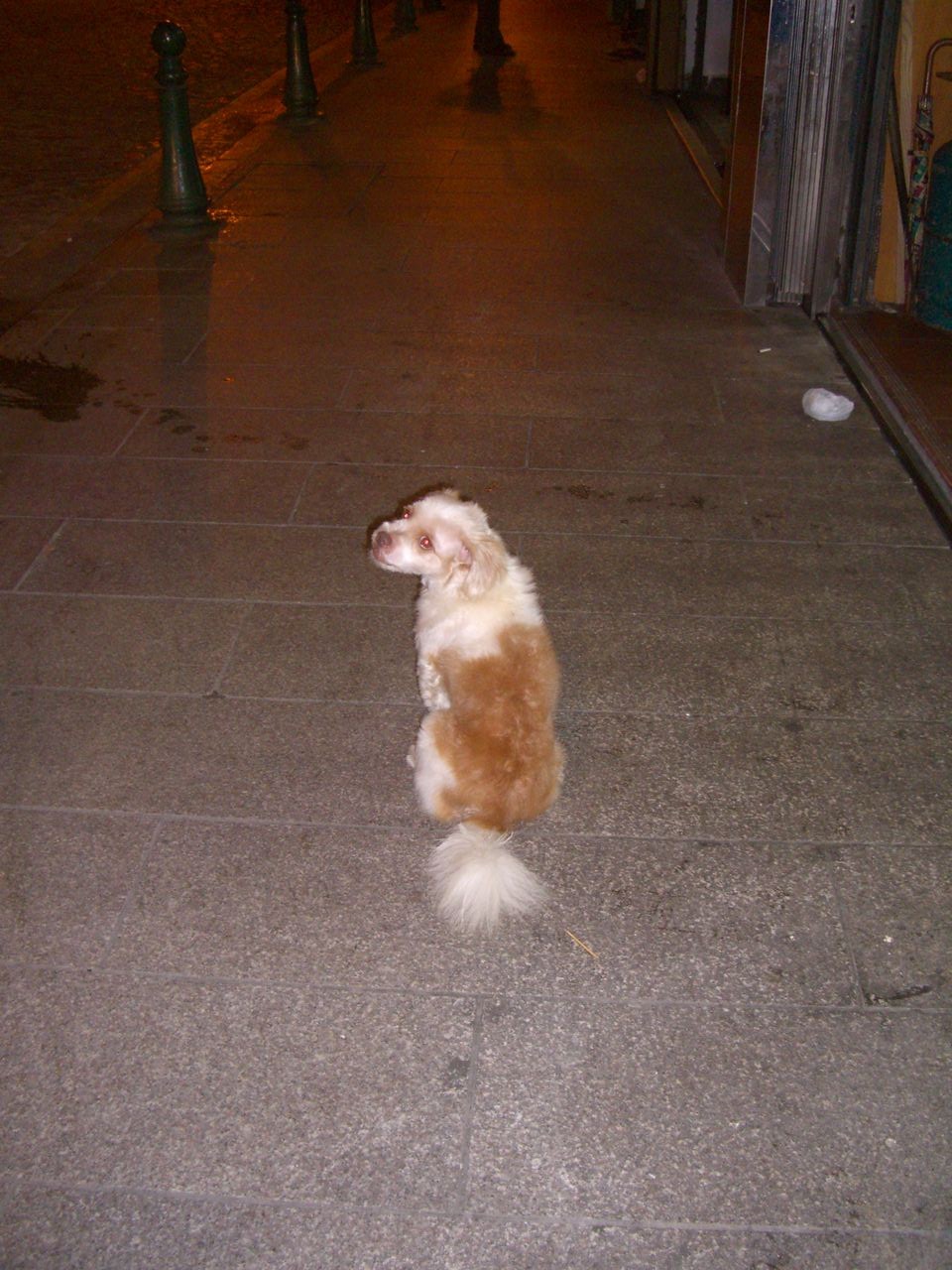 先を急ぐべく街を歩いているとわんこが振り返り。