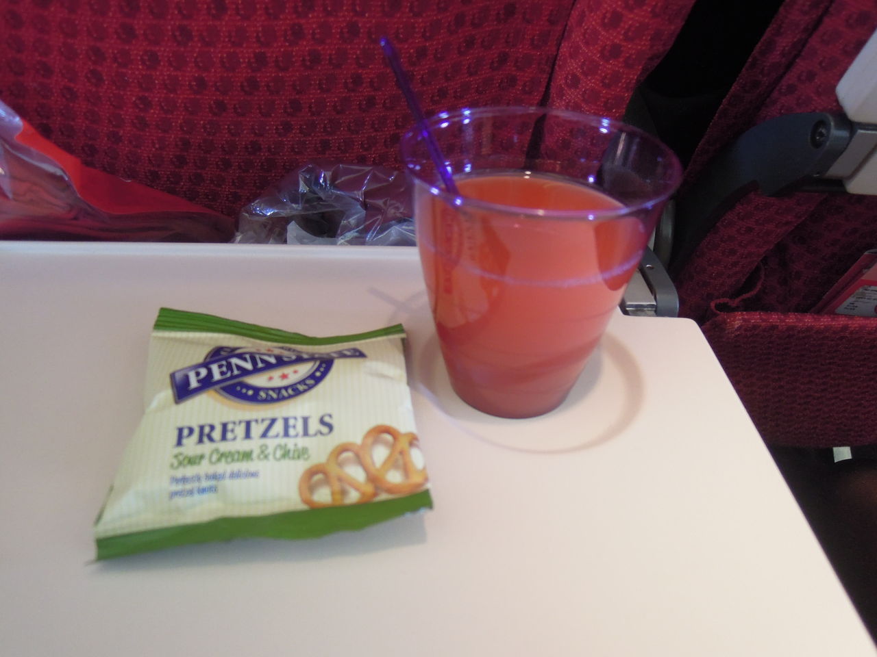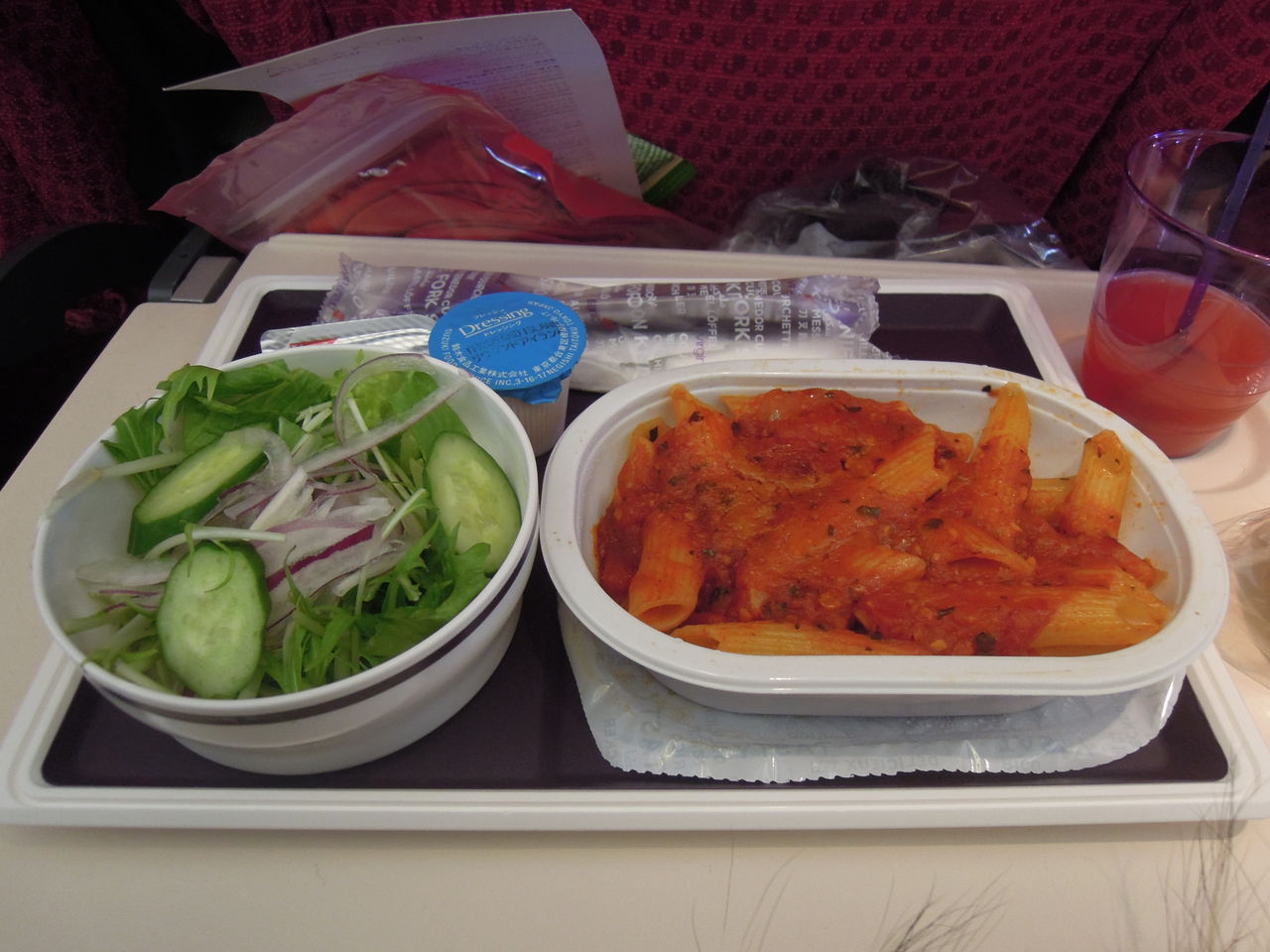 一度目の機内食は3種類から選べたのでトマトソースのペンネを。
