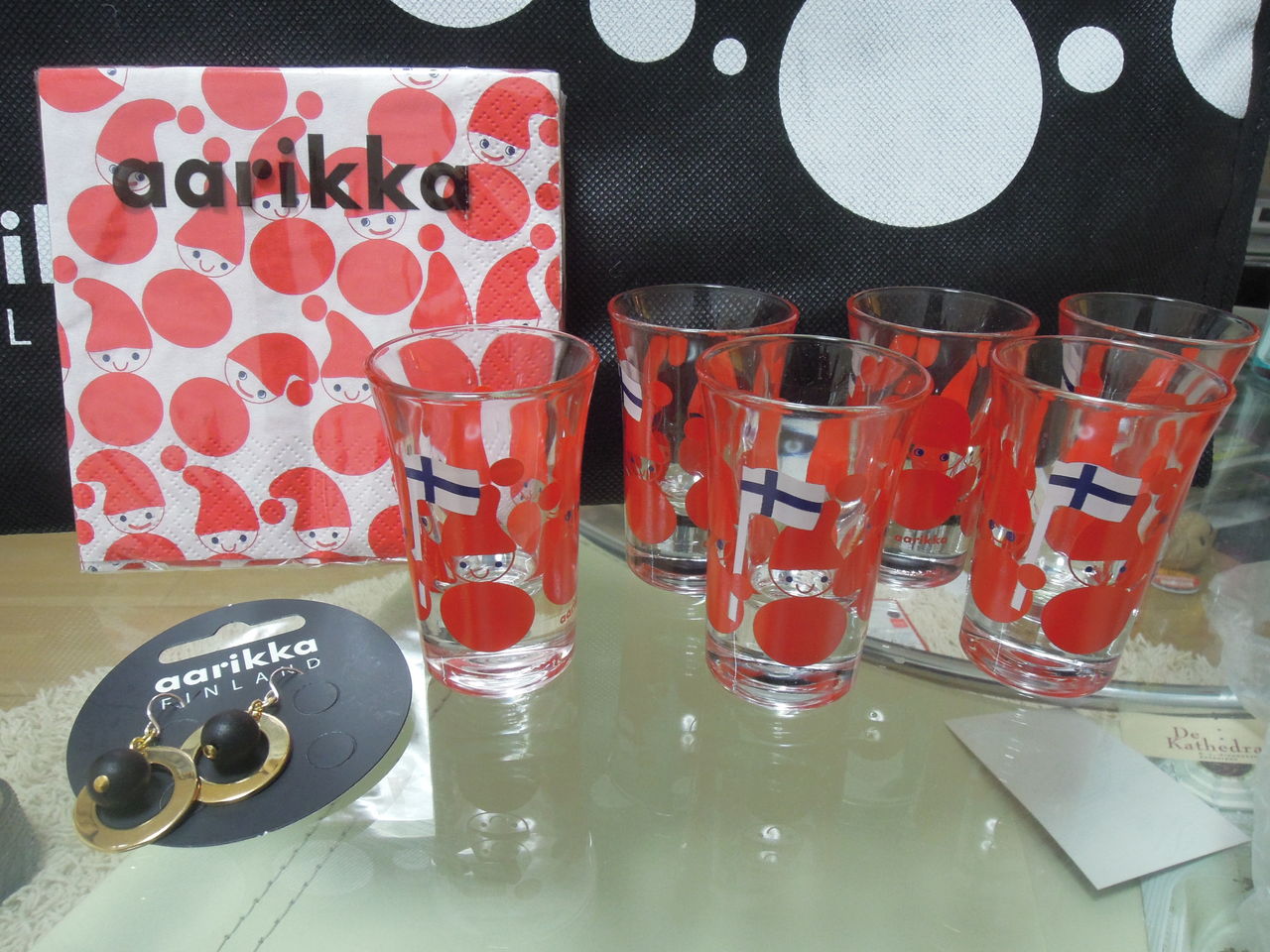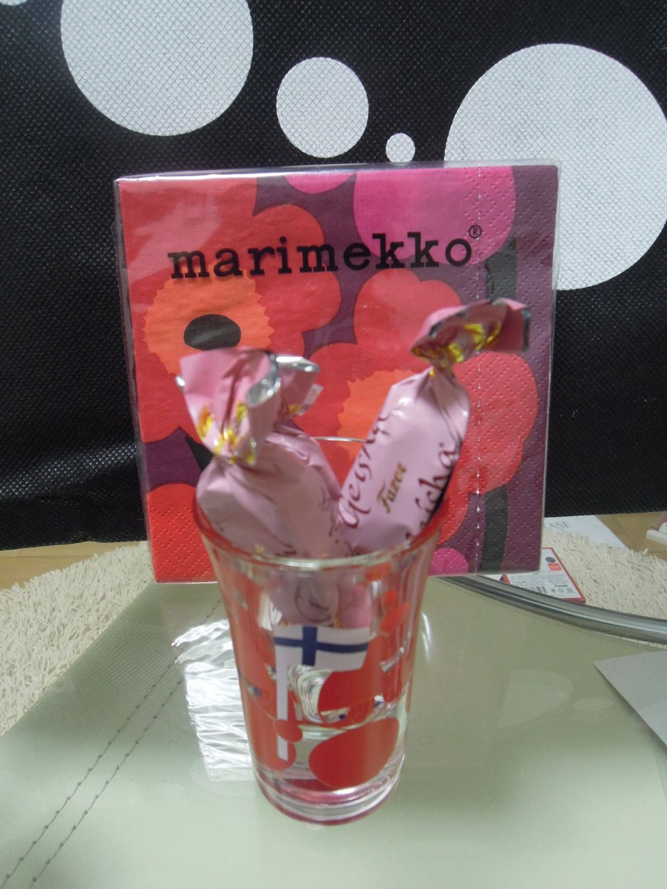 アーリッカのショットグラスにチョコを入れて、マリメッコのナプキンをつけて出来上がり。