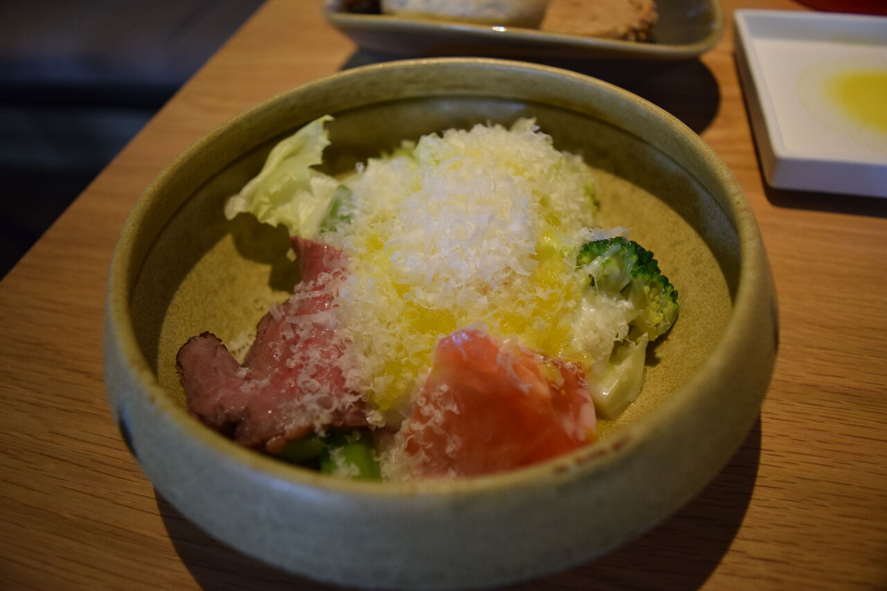レタス、ブロッコリー、トマト、ハム等の上に温泉卵。