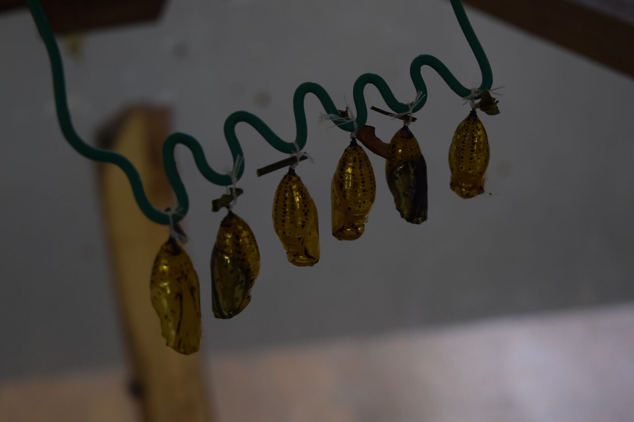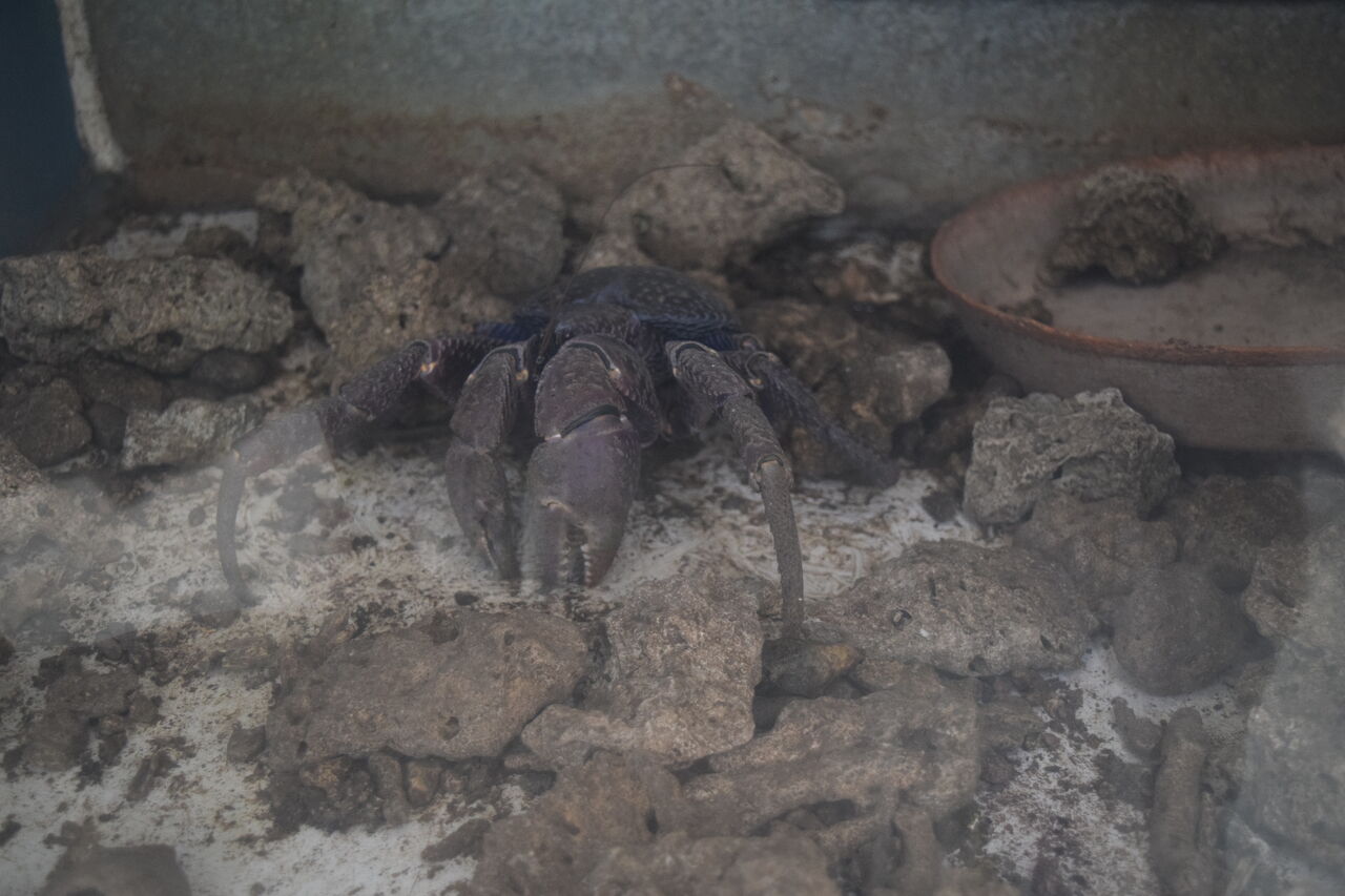 この鍾乳洞の入口には蝶のサナギやヤシガニが展示。
