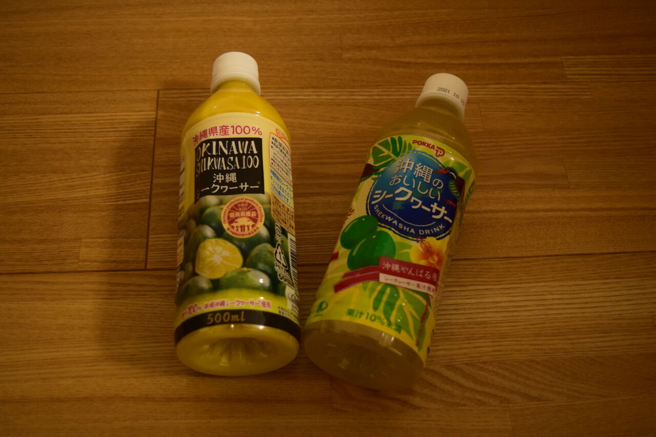 シークワーサージュースと果汁100%のシークワーサー。