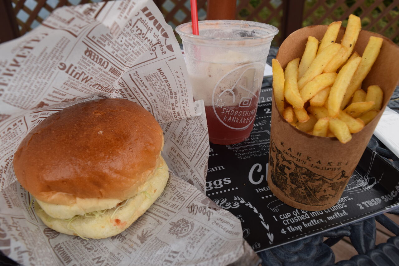駅前のフードコートでオリーブ牛コロッケバーガーを。
