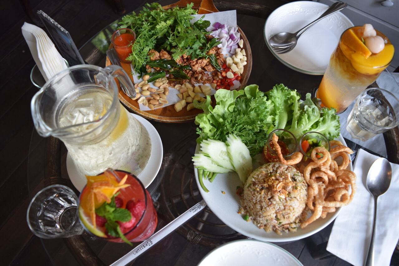 お食事はクリスピーチキンとラープ炒飯なるものを。