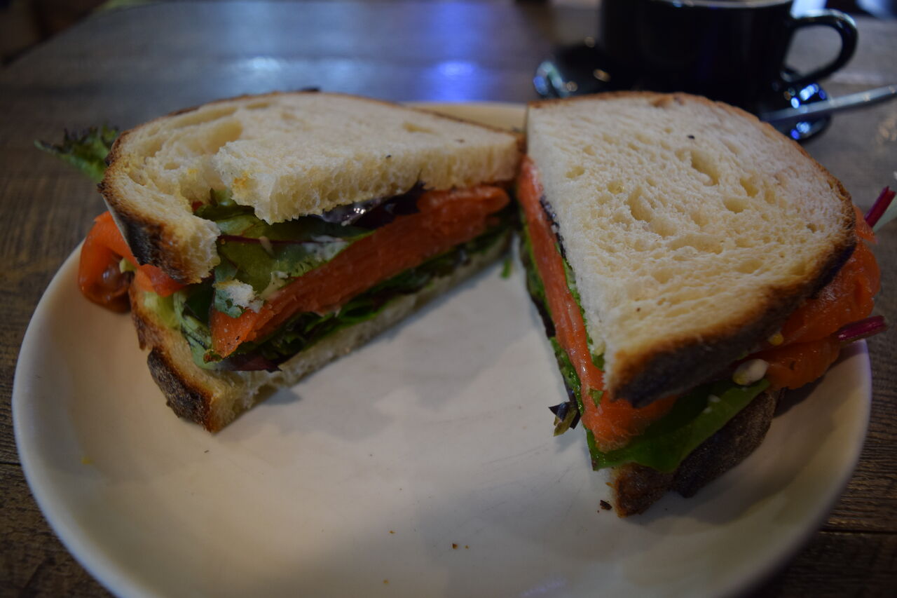 頼んだのはサーモンサンドとコーヒー。
